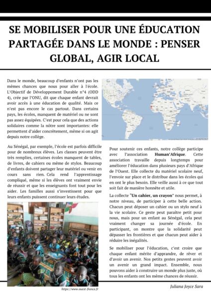Depuis de nombreuses années, le collège se mobilise pour collecter du matériel scolaire. Cette année, destination le Sénégal, en partenariat avec l’association Human’Afrique située à Saint Genis les Ollières.