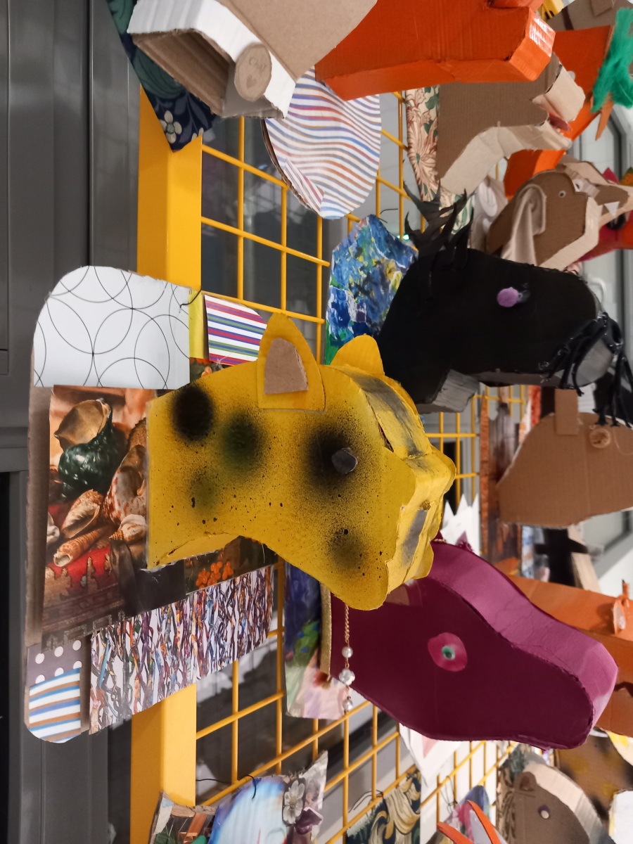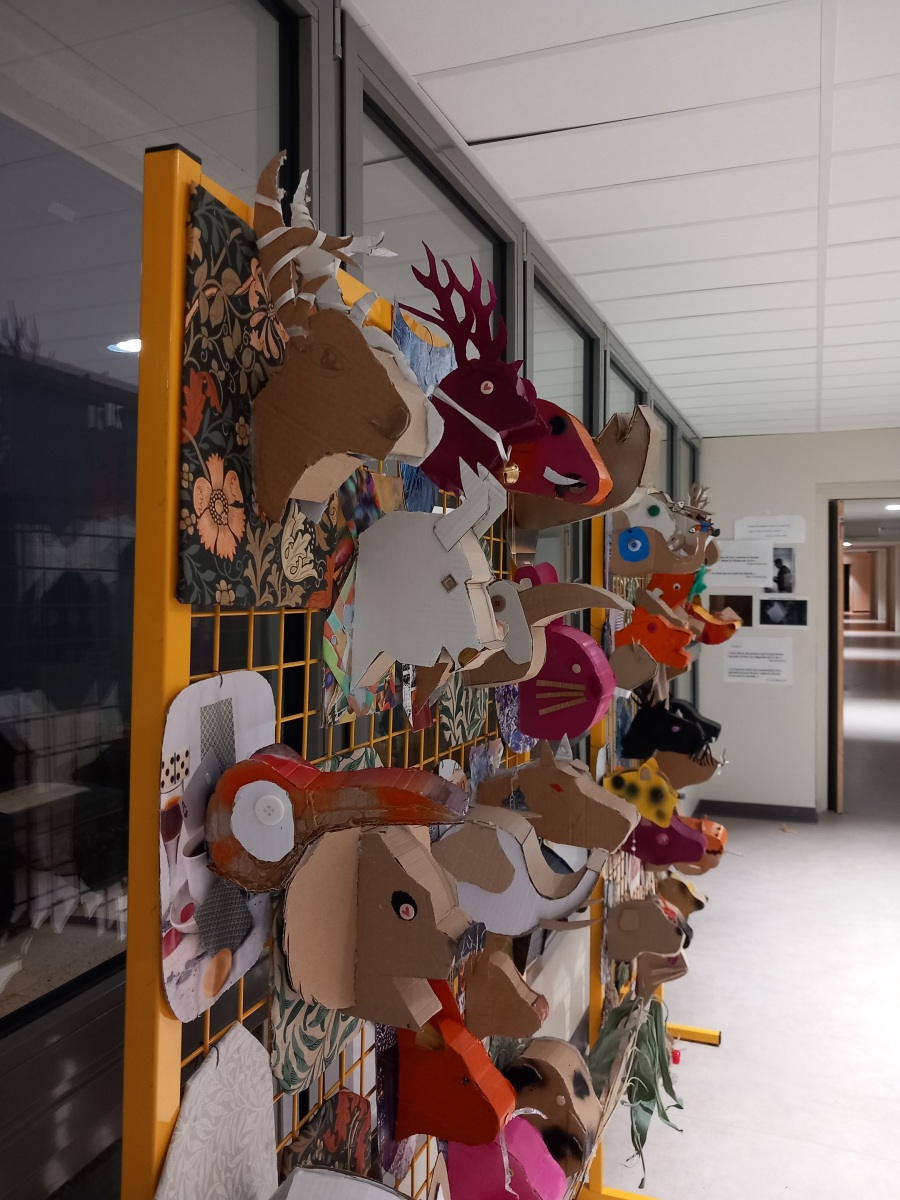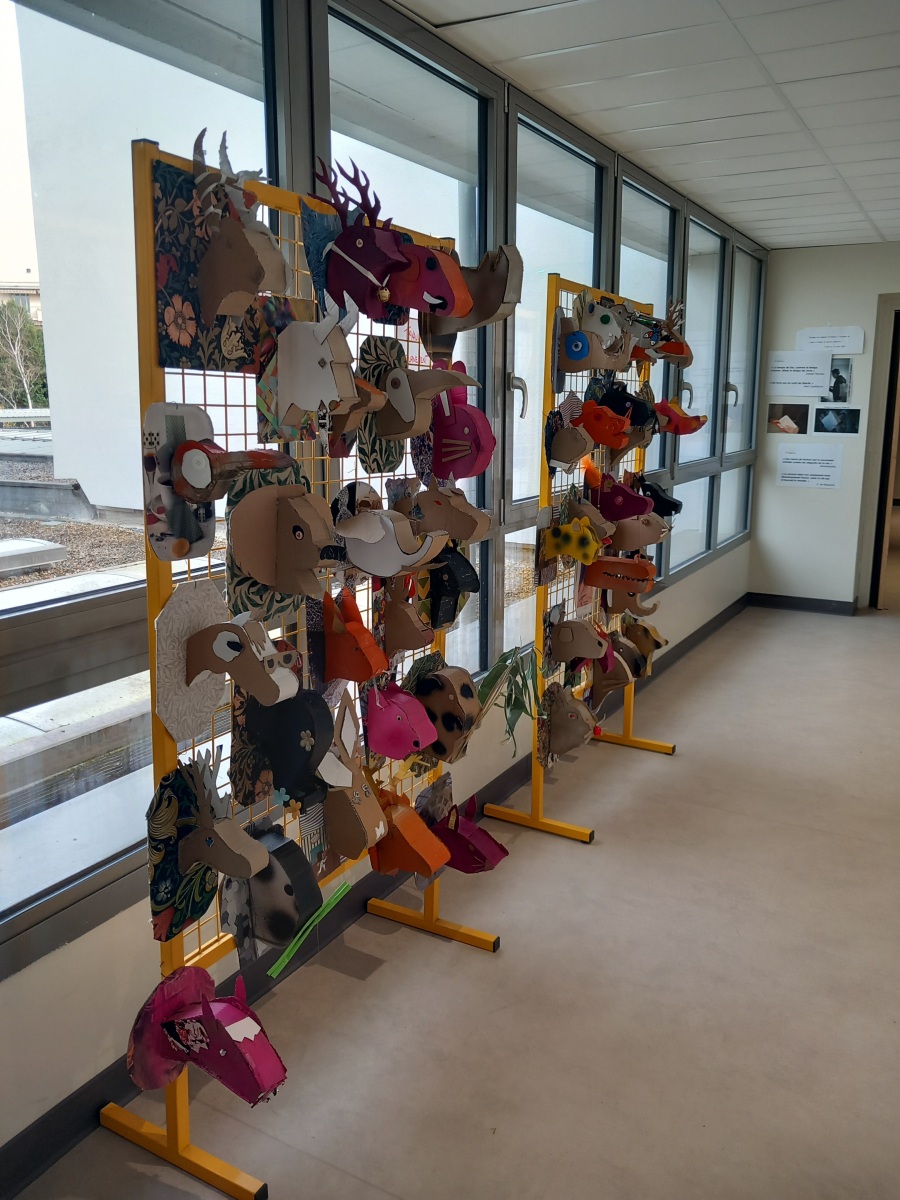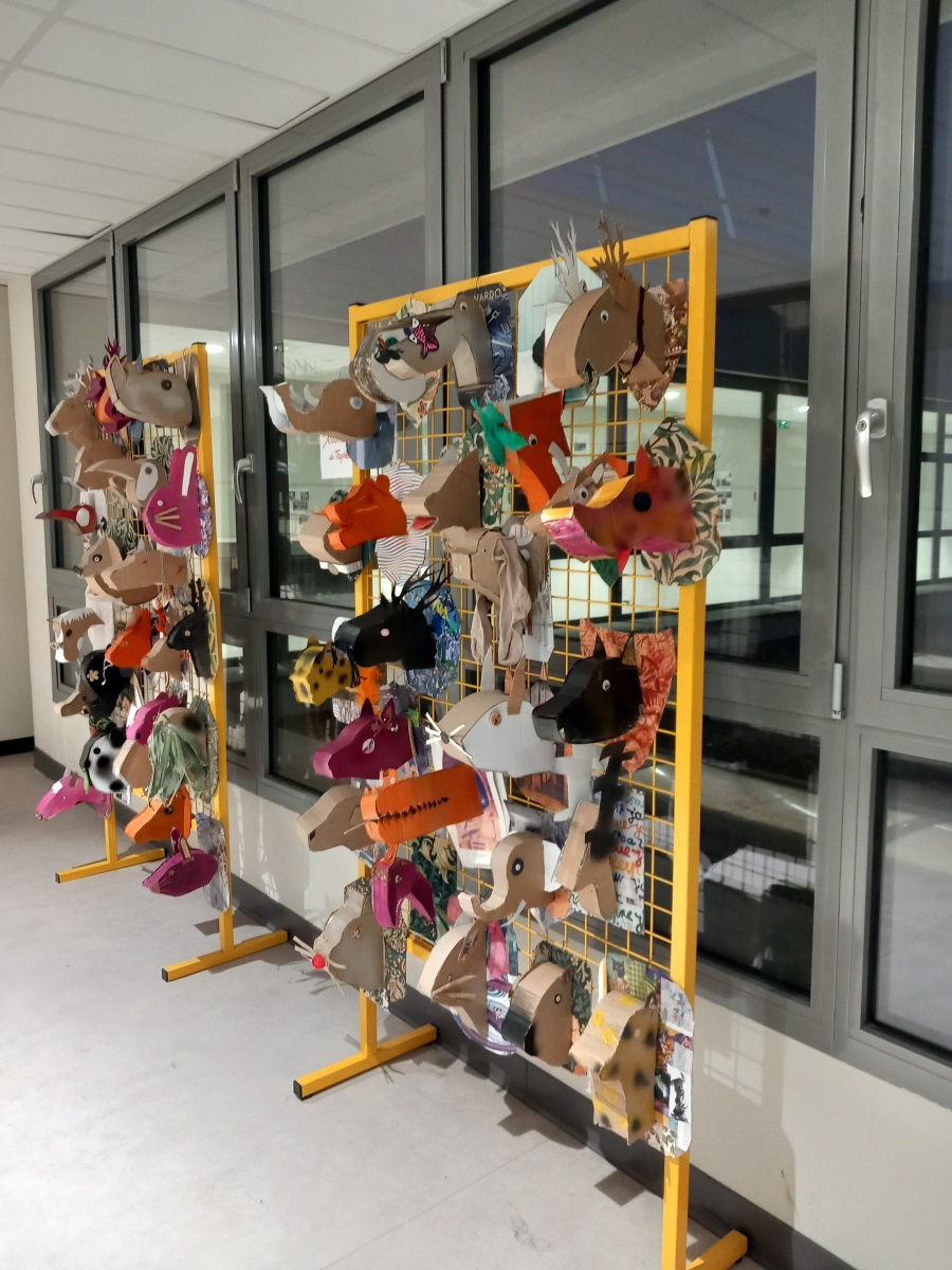 En lien avec la création d’objets en 3 dimensions, les élèves de 6èmes, ont réfléchi au détournement du trophée de chasse à partir de l’analyse de l’œuvre de l’artiste Anne Valérie Dupont. Les élèves ont dû fabriquer en carton la forme de leur animal en la stylisant et la simplifiant puis ont travaillé sur le support sur lequel est suspendu leur animal.