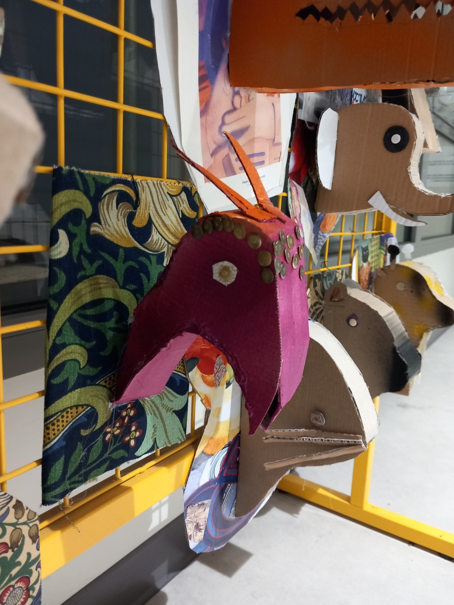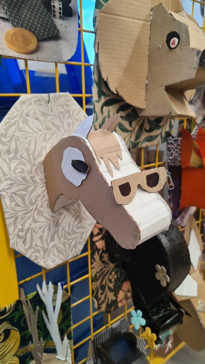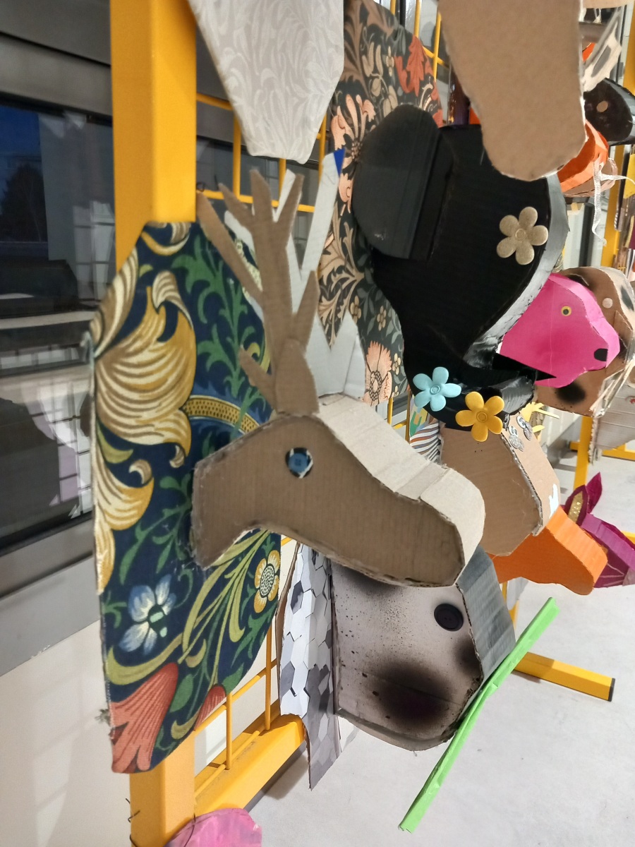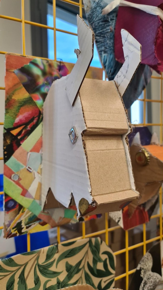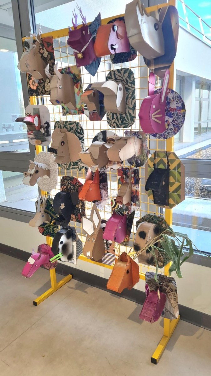 En lien avec la création d’objets en 3 dimensions, les élèves de 6èmes, ont réfléchi au détournement du trophée de chasse à partir de l’analyse de l’œuvre de l’artiste Anne Valérie Dupont. Les élèves ont dû fabriquer en carton la forme de leur animal en la stylisant et la simplifiant puis ont travaillé sur le support sur lequel est suspendu leur animal.