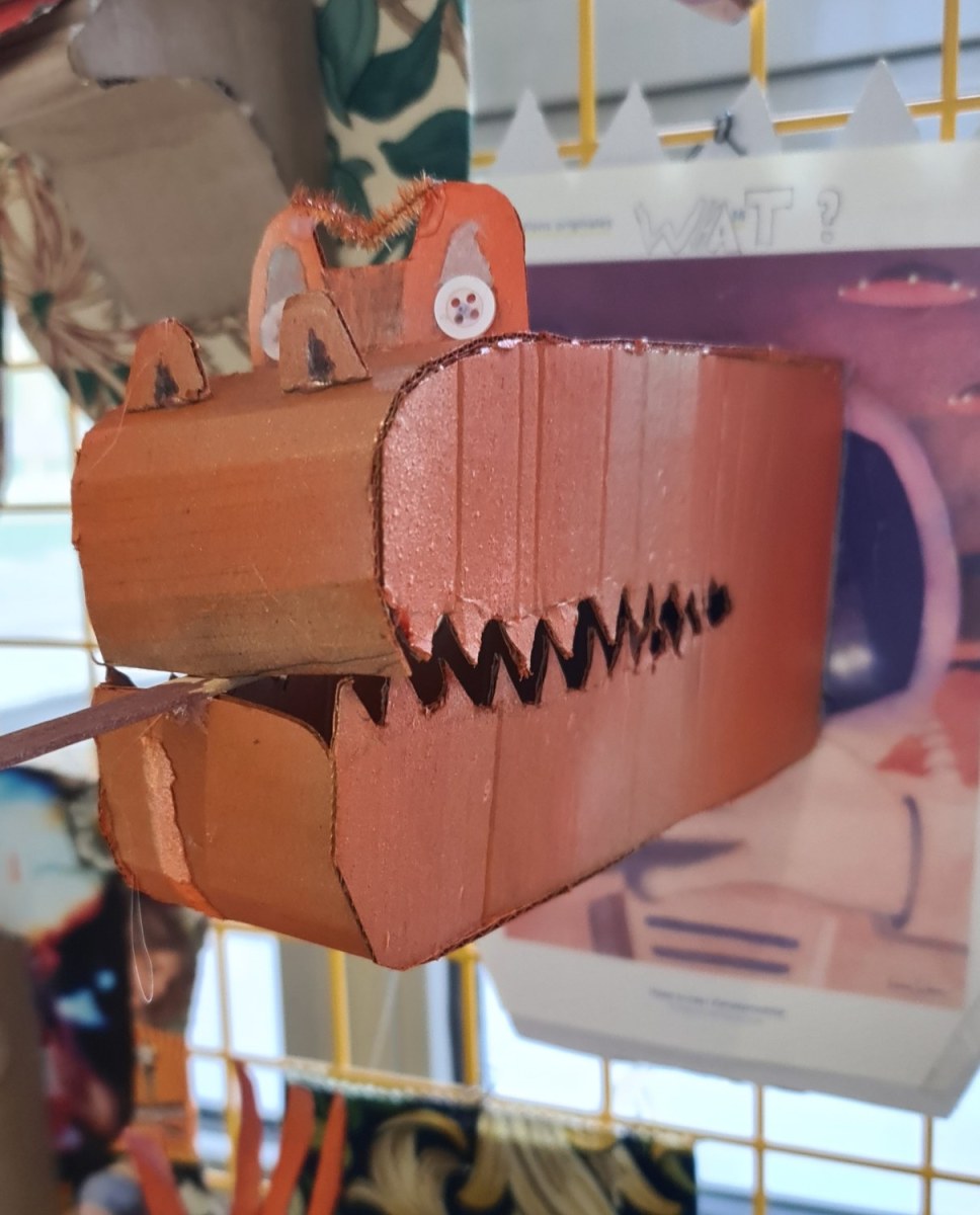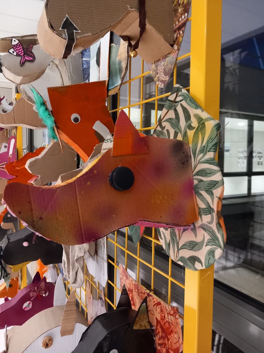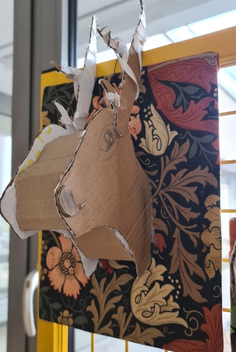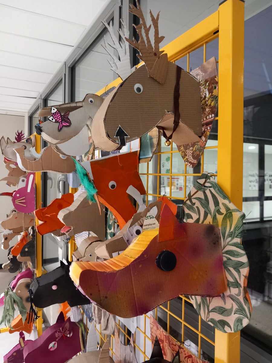 En lien avec la création d’objets en 3 dimensions, les élèves de 6èmes, ont réfléchi au détournement du trophée de chasse à partir de l’analyse de l’œuvre de l’artiste Anne Valérie Dupont. Les élèves ont dû fabriquer en carton la forme de leur animal en la stylisant et la simplifiant puis ont travaillé sur le support sur lequel est suspendu leur animal.