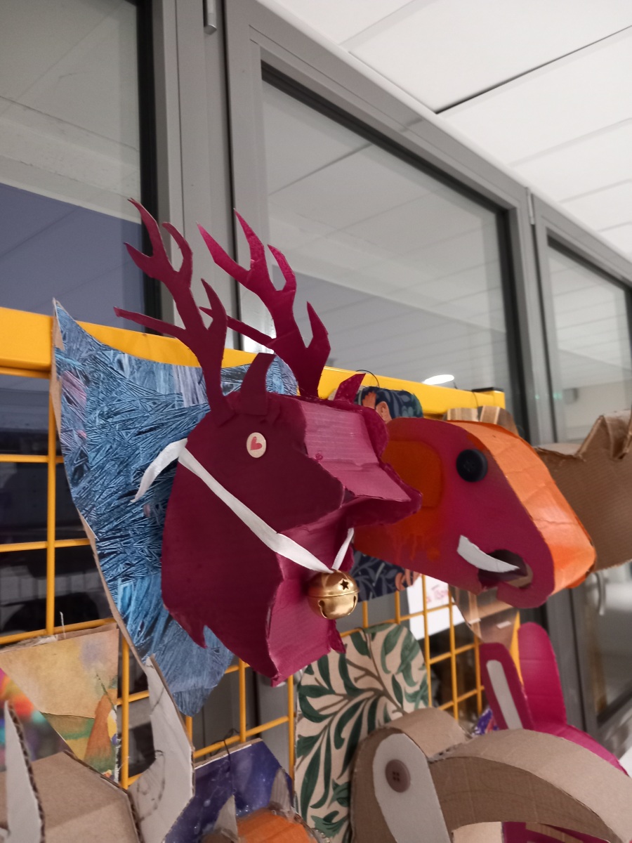 Bombes de peintures, sélection d’images d’œuvres d’art plus tout ajout personnel d’accessoires ont été expérimentés. Les travaux sont actuellement visibles dans la galerie, ils apportent formes et couleurs et participent aussi à l’ambiance de Noël pour la plus grande joie de tous. Mme Rivollier Pourcelly